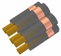 | Die sechseckigen Silikonspacer werden an einer definierten Stelle angebracht. Es gestattet, die einzelnen Rohre in einer 60° Teilung zu positionieren. Das Silikonmaterial absorbiert Vibrationen, ermöglicht eine starre Konstruktion der Bündel und die Vorpositionierung der Rohre zur Einführung in Rohrböden. |