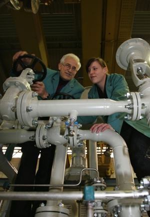 Boulos Alnajjar und Karolin Rüther von der Firma MAN Turbo AG kontrollieren die Ölversorgungsanlage, die sie vom Plauener Unternehmen Tubetech gekauft haben. Sie wird demnächst nach Ägypten verschifft. |